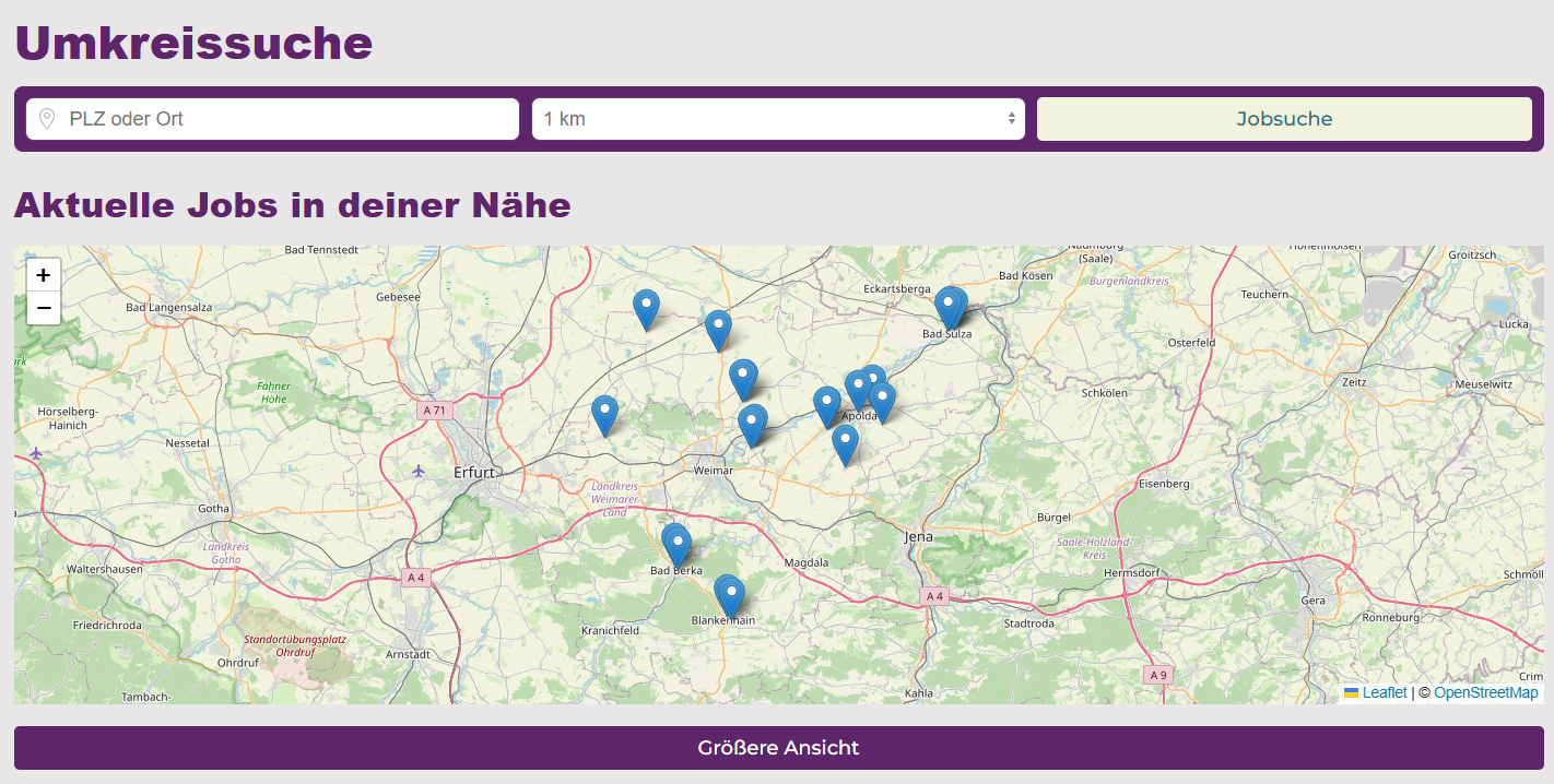 Auf der Suche nach dem für Dich passenden Job kannst du die Umkreissuche nutzen oder dir mittels Karte einen Überblick verschaffen.