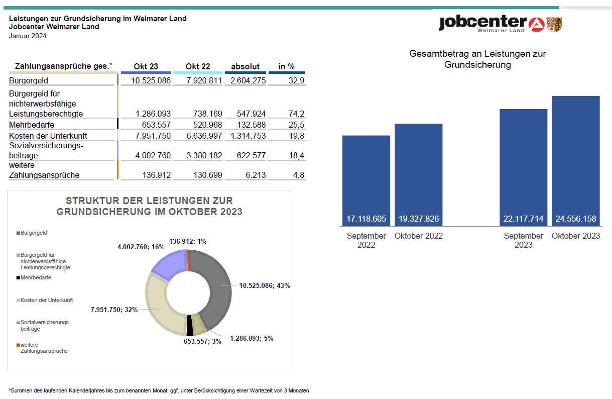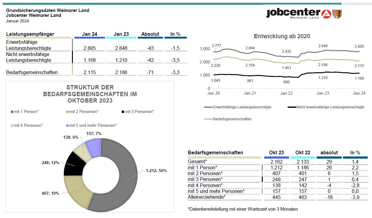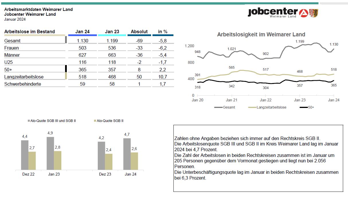 Die Arbeitslosigkeit ist im Weimarer Land im Januar 2024 gestiegen. 2.056 Menschen waren arbeitslos gemeldet. Das waren 205 Personen (11 Prozent) mehr als im Dezember, aber 66 Menschen bzw. 3 Prozent weniger als vor einem Jahr. Die Arbeitslosenquote betrug 4,7 Prozent und lag mit 0,5 Prozentpunkten über dem Vormonatsniveau. Vor einem Jahr lag sie bei 4,9 Prozent.