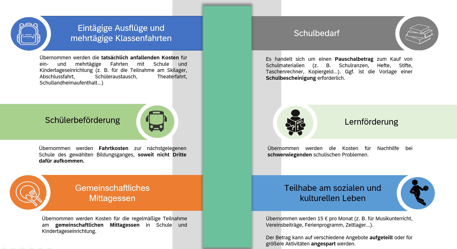Welche Leistungen im Rahmen von Bildung und Teilhabe bewilligt werden können, ist der nachfolgenden Übersicht zu entnehmen: